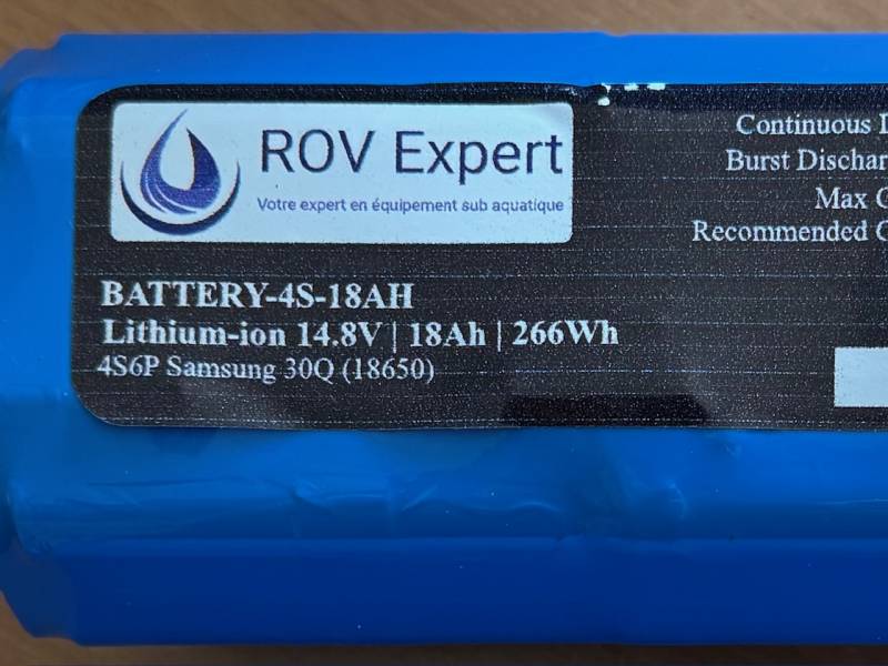 L'autonomie a été augmenté en remplaçant la batterie d'origine par 2 batteries 4S de 18Ah en provenance de notre partenaire ROV Expert. L'éclairage a été doublé par l'ajout de 4 projecteurs supplémentaires, 2 à l'avant et 2 à l'arrière sur le skid.